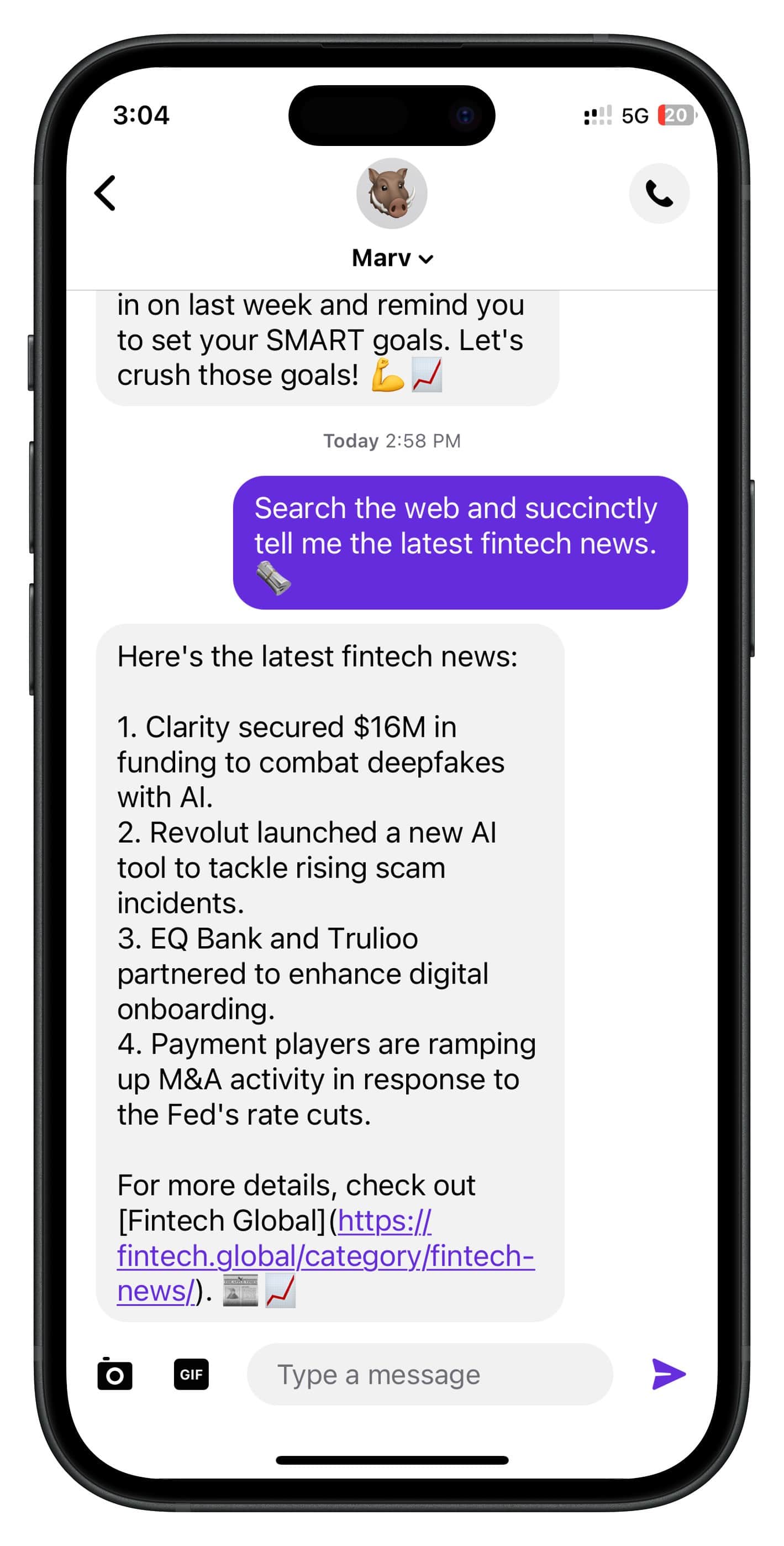 Privacy is Marv's top priority. He only stores enough data to keep conversations relevant, and uses industrial-grade privacy standards, meaning your data stays secure, is never used for training models or shared with anyone. Plus, if you ever want to say goodbye, just send "clear", and Marv will forget everything, leaving no trace behind. Read more here.