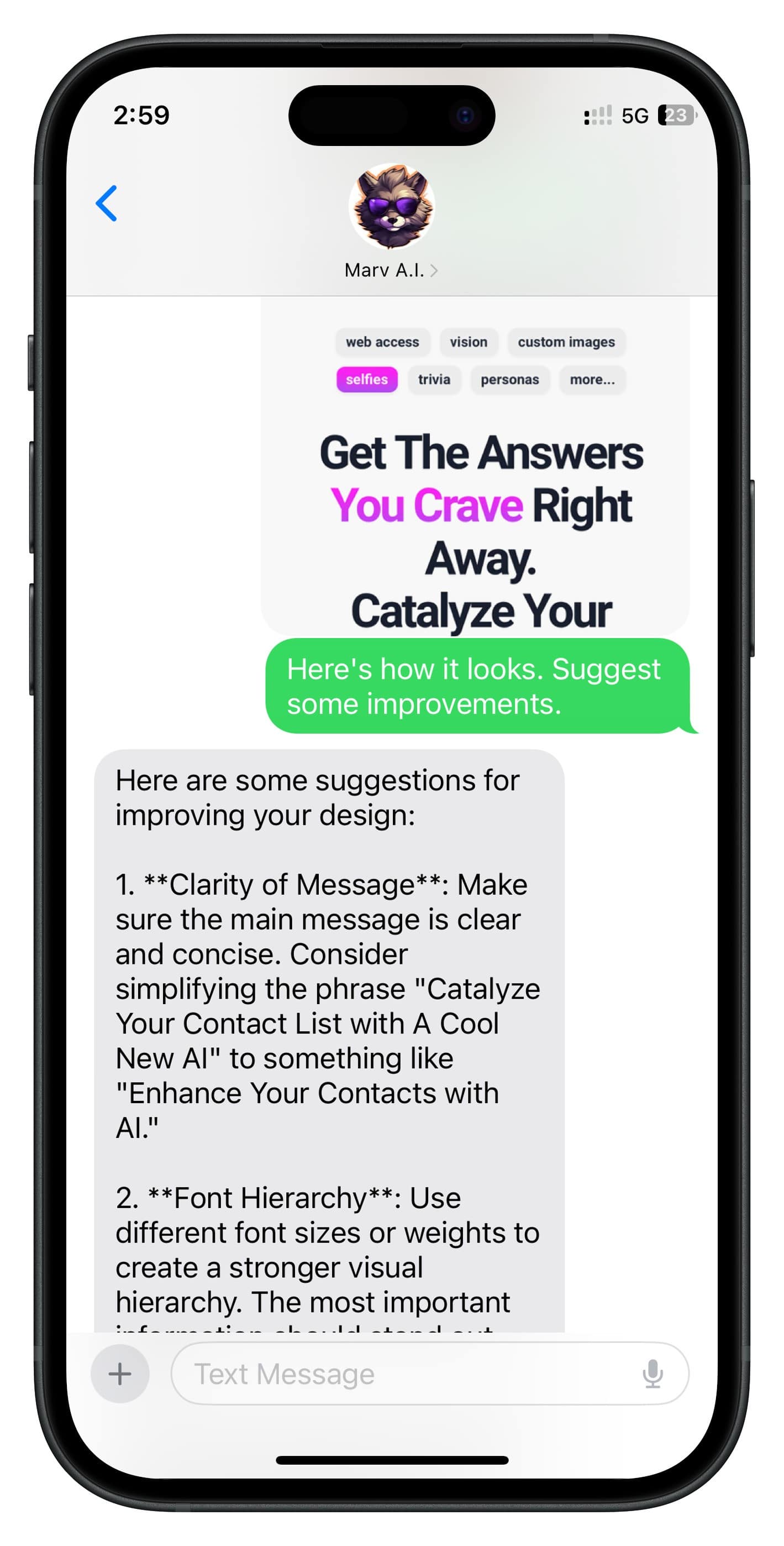 Turn text recognition into a breeze or explore your world by asking questions about what's in your photos. With Marv, you just can just snap, send, and ask. I've been having a lot of fun with this feature, and I'm sure you will too.