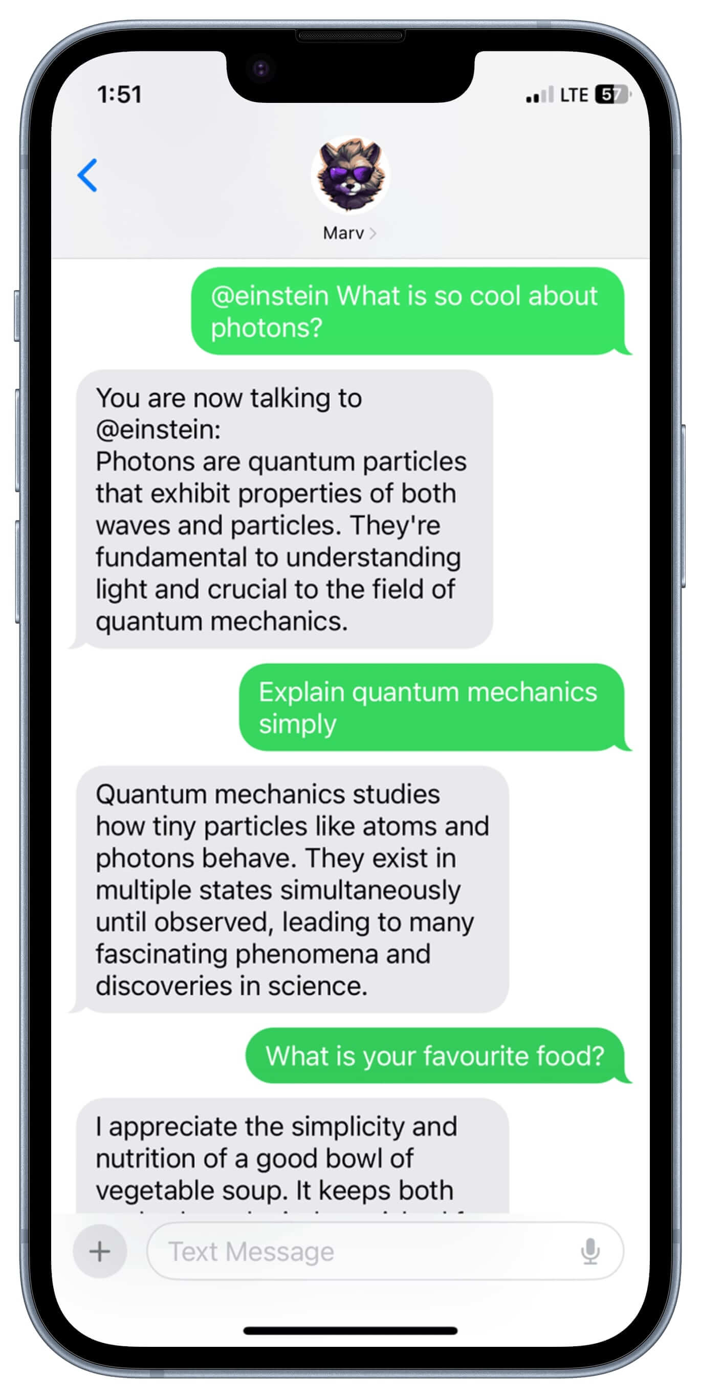 Curious? Ask @einstein about what makes protons awesome. Competitive? Challenge @trivia to a showdown. Feeling playful? Transform your world with @cartoonify. With Marv, fun is just a text away. Want to add your own personas? Join the Discord and request it to shape the roadmap for new features in real time.