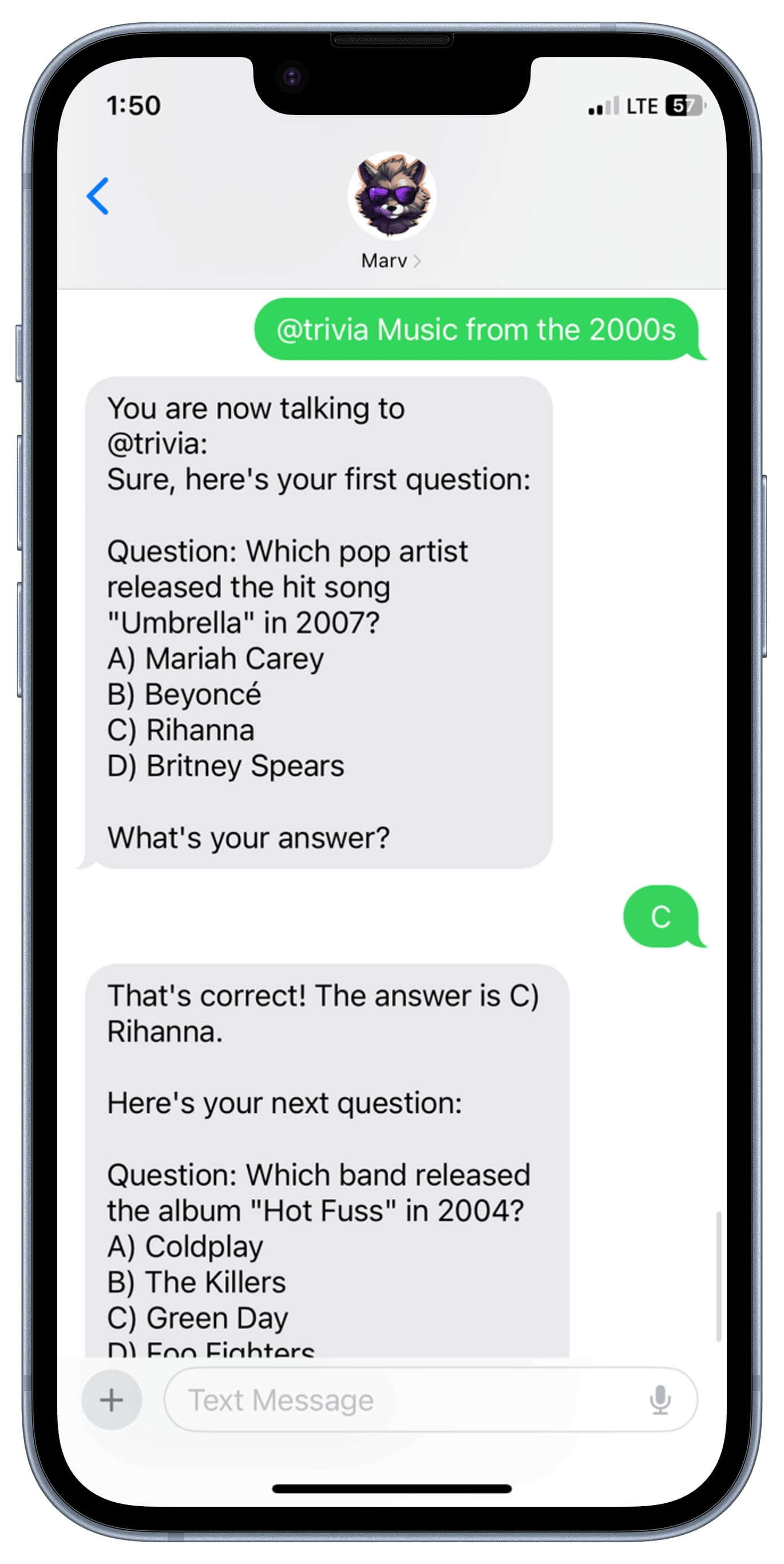 Marv operates from a phone number based in Canada. If that has an associated cost for you, you can also message him on WhatsApp. Select your preference when signing up!.
