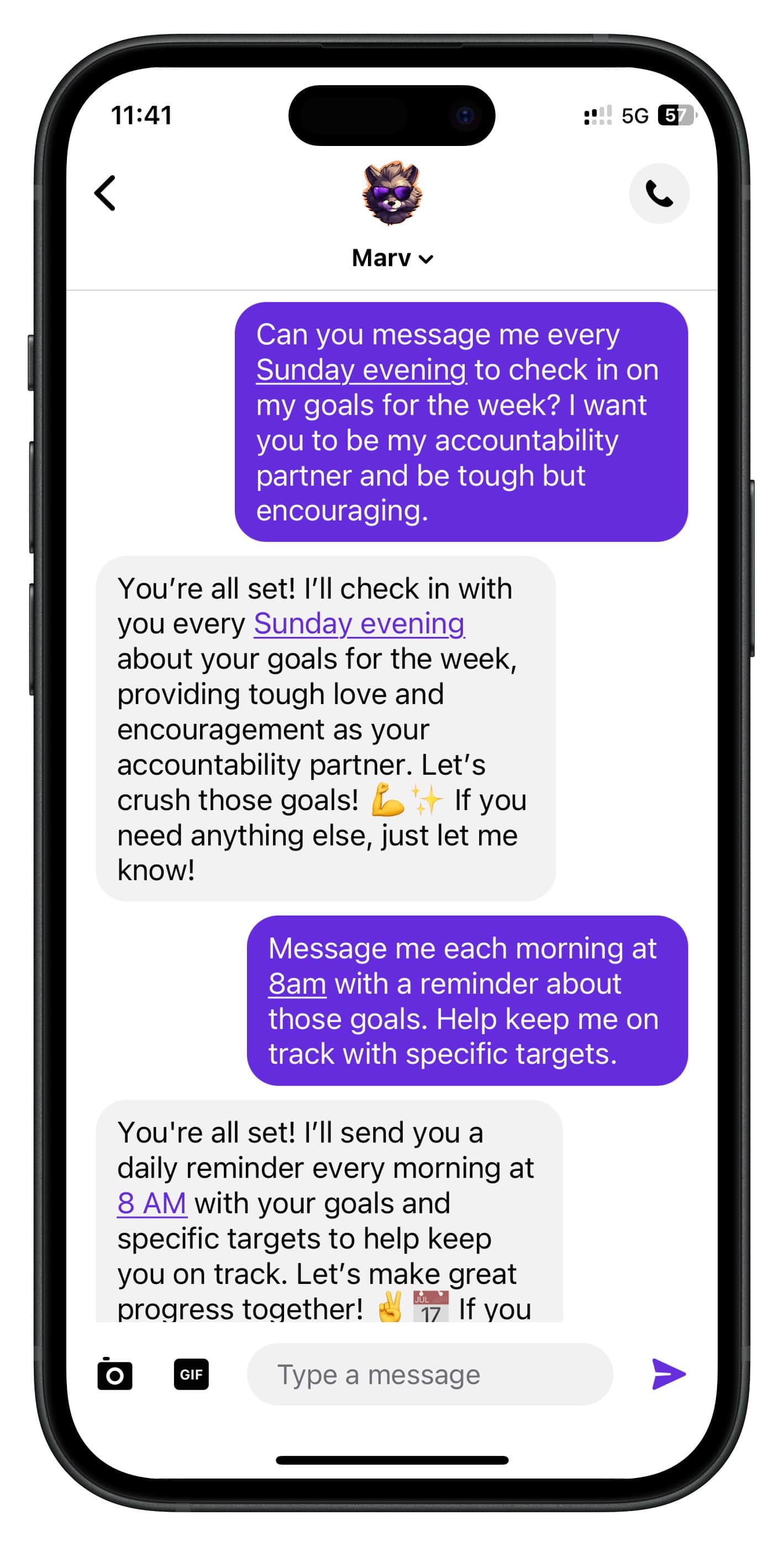 Marv gives you instant access to the information you need, and can schedule tasks and messages for the future. Whether it's your grocery list, weekly goals, or a random fact you need later.
